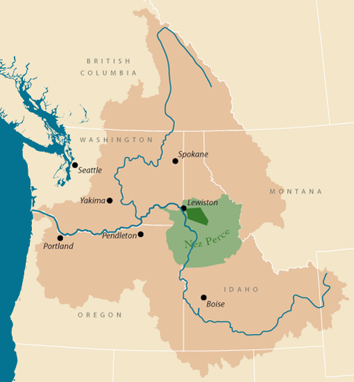 You cannot be in this part of the country without encountering the historic flight of a band of "non-treaty" Nez Perce Indians trying to escape being rounded up and sent to their reservation, an area approximately 1/50th of their traditional hunting and fishing area in parts of Washington, Oregon, Idaho, Montana and Wyoming. The Treaty of 1855 created the reservation shown in light green. The discovery of gold in 1860 forced a new Treaty of 1866 which reduced the reservation to the area in dark green, 1200 square miles. A significant number of the tribe, approximately 1000 people, did not accept the treaties and were known as the "non-treaty" indians. In attempting to force this group into the reservation, a war broke out in 1877. General Howard had a command of 5,000 men and started chasing this band from the reservation to the east.