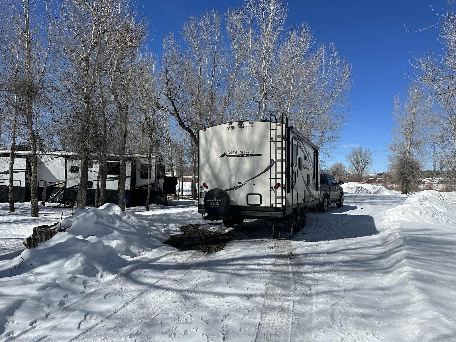 I got there at 5:45, pulled past where the campground host had lived, and everything was in a couple of feet of snow. I couldn’t see the site I reserved. I got out and started walking on the ice and snow packed main road back to where the campground host used to live. I heard behind me a lady calling, “Sir, can I help you, what do you want?” “I have a reservation for site B.” “When?” “Tonight.” Pause…..”uhhh, everyone here is permanent and I don’t have any open sites. We haven’t had anyone visit in months.” “Oh…? Yeah, I can see that. Is there anywhere I can just plug in?” “Well, no one is parked on that road and the electrical box is fairly close. You can park in the road there. Everyone else can just drive around the outer loop.”